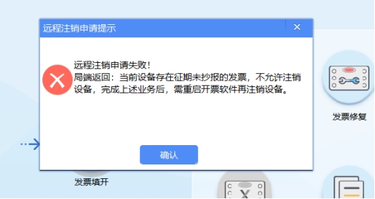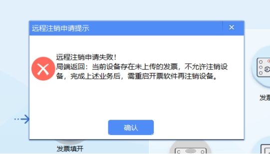 (2)如校验不通过,则自动弹出相应提示,纳税人按提示完成对应业务后,重启开票软件即可再次进行远程注销税控设备操作,如图3、图4、图5等所示。