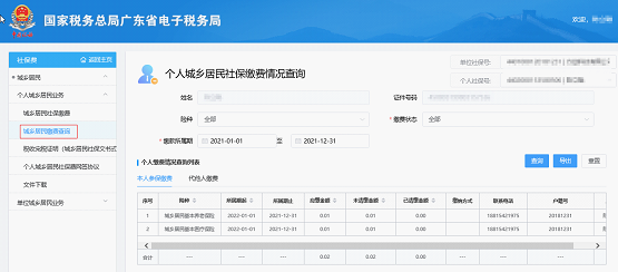 个人城乡居民社保缴费情况查询主界面(本人参保缴费)
