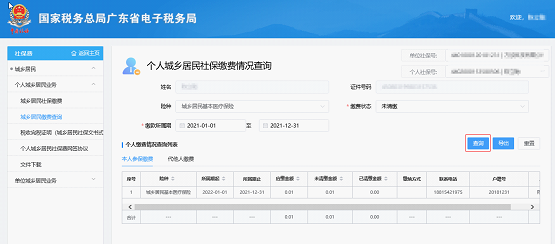 【查询】:城乡居民参保人员登录,默认带出本人的参保缴费信息;