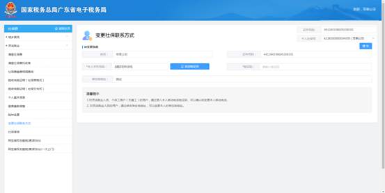 b) 在【待变更信息】中,编辑需要变更的信息后,点击【发送验证码】按钮,系统提示“发送验证码成功!”,本人手机号码将会收到验证码短信;