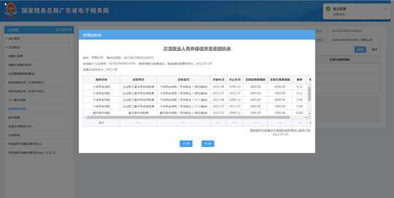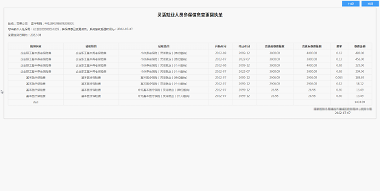 d) 缴费基数调整提交成功后,系统弹窗显示“灵活就业人员参保信息变更回执单”;在该弹窗界面中,点击【打印】按钮进入打印预览界面进行打印操作,点击【关闭】按钮返回上一页即参保信息变更主界面;