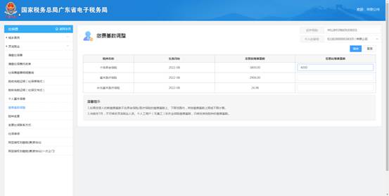 b) 在“缴费基数调整”行填入变更后的内容,确定填写无误后点击【确定】按钮;