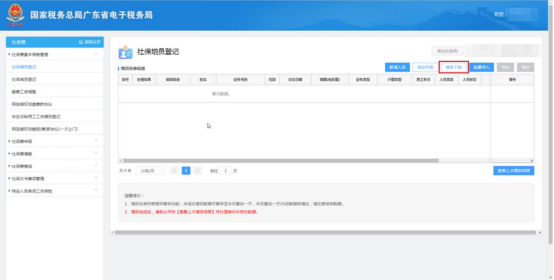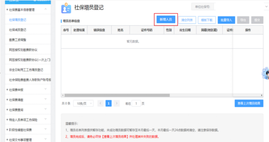 1.点击菜单【社保增员登记】模块功能,进入社保增员登记界面;点击【模板下载】按钮下载空模板,录入新增人员信息。(增员模板文件)