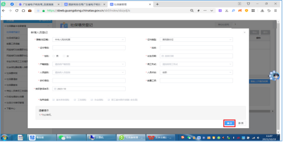 4.在“新增人员登记”窗口填写新增人员信息,填写完成后,点击【确定】。