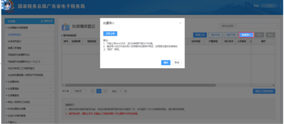 2.点击【批量导入】按钮,选择已经编辑好的增员名单文件上传。(注:单次批量导入的增员文件,人数不可超过一千人,若增员人数超过一千人,则需要分多次重复导入操作。)