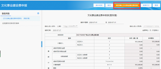 5.若您为文化事业建设费缴费人,则需保存确认主税和附加税费申报表后,才能填写文化事业建设费申报表。