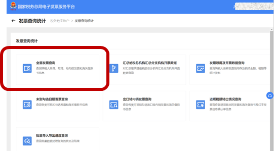开票方和受票方均可通过税务数字账户查询开具和接收的发票。进入路径:广东省电子税务局——【我要办税】——【税务数字账户】——【发票查询统计】——【全量发票查询】