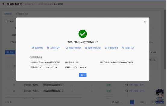 设置好发件邮箱之后,点击【邮箱交付】,输入接收方邮箱账号,选择交付格式,点击【确定】即可将发票发送到接收方邮箱,完成邮箱交付。