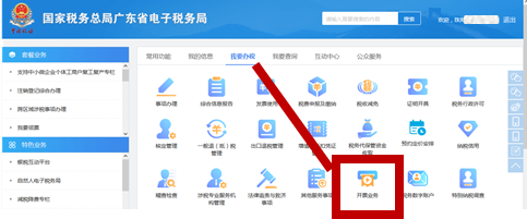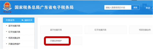 通过广东省电子税务局进入“我要办税”模块,功能菜单依次选择【开票业务】-【开票信息维护】。