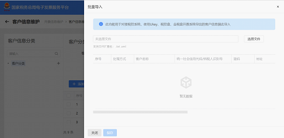 系统弹出批量导入页面,点击【选择文件】即可浏览本地文件,选择此前从税务UKEY/金税盘/税控盘导出的客户信息文件上传。导入完毕后,点击【保存】按钮。