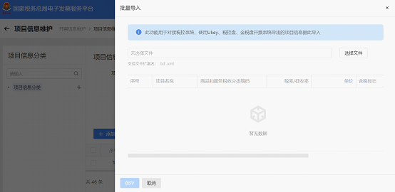系统弹出批量导入页面,点击【选择文件】即可浏览本地文件,选择此前从税务UKEY/金税盘/税控盘导出的开票项目信息文件上传。导入完毕后,点击【保存】按钮。