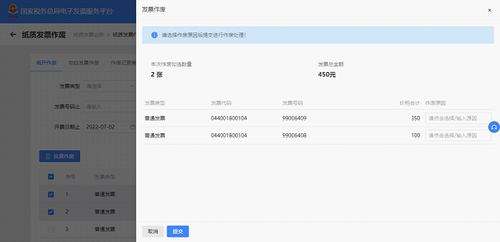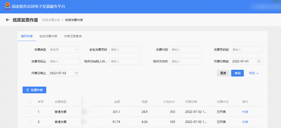选择“填开作废”页签,勾选所需作废的发票后,点击“批量作废”;或单独点击操作列的“作废”,弹出发票作废页面。选择作废原因后,点击“提交”按钮。