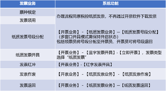 用票业务功能包括【纸质发票作废】、【纸质发票退回】、【纸质发票号段分配】。
