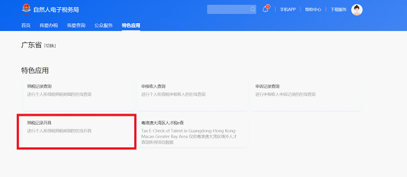您说的个人所得税纳税情况证明,2019年及以后为《个人所得税纳税记录》,2018年及以前为《税收完税证明》。2019年及以后的《个人所得税纳税记录》,可以登录自然人电子税务局网页端(网址:https://etax.chinatax.gov.cn),网上开具并下载打印。在自然人电子税务局网页端,用个税APP扫描登录,在首页选择【特色应用】栏目。