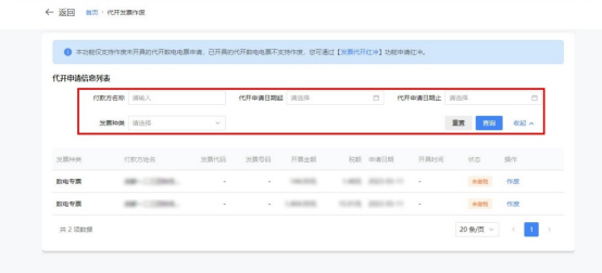 2.纳税人进入功能页面,自动带出最近的代开发票信息。纳税人也可以通过填写搜索框,点击【查询】选出想要作废 的代开发票信息。