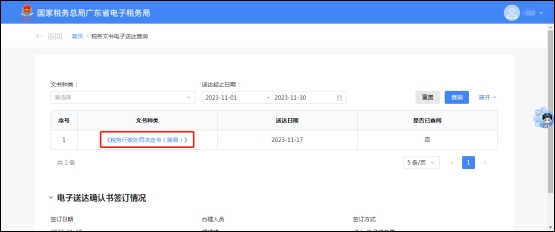 1.如纳税人告知书内容无异议,选择“无异议”并点击下方“接受处罚”,系统生成《税务行政处罚决定书(简易)》并发送给纳税人;若纳税人3天内未反馈,系统将自动生成《税务行政处罚决定书(简易)》。纳税人可在首页【我的待办】-【待签收文书】中可以看到,也可通过【我要查询】-【税务文书电子送达查询】-【税务文书送达确认】模块查看。