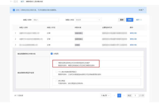 (1)点击选择解除原因为【离职后原任职单位未及时报告税务机关维护 需提供资料:离职证明或其它可证明已离职的资料】。
