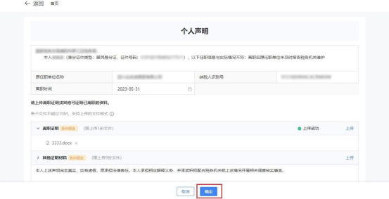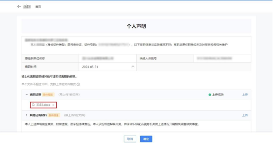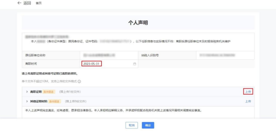 1)跳转个人声明界面,选择【离职时间】,点击【上传】上传对应资料。