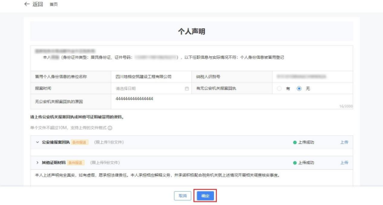 1)跳转个人声明界面,输入原因。点击【上传】上传其他证明资料。