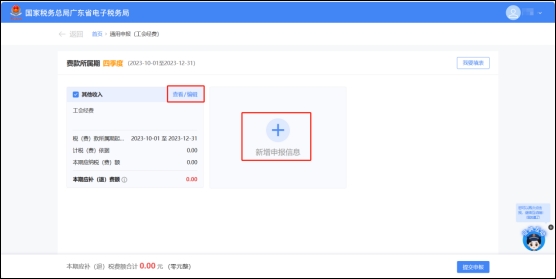 可直接点击【查看/编辑】按钮填写,或通过点击【+新增申报信息】按钮,增加卡片填写,确认预填数据是否正确,如税(费)款所属期、应税所得率等,并进行其他信息项补充,如征收品目、征收子目、应税项。