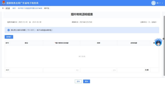 3. 点击卡片上的【税源采集】,录入税源信息,填写完毕后点击【提交】,完成税源采集。如需采集多条税源信息,点击【新增行】。