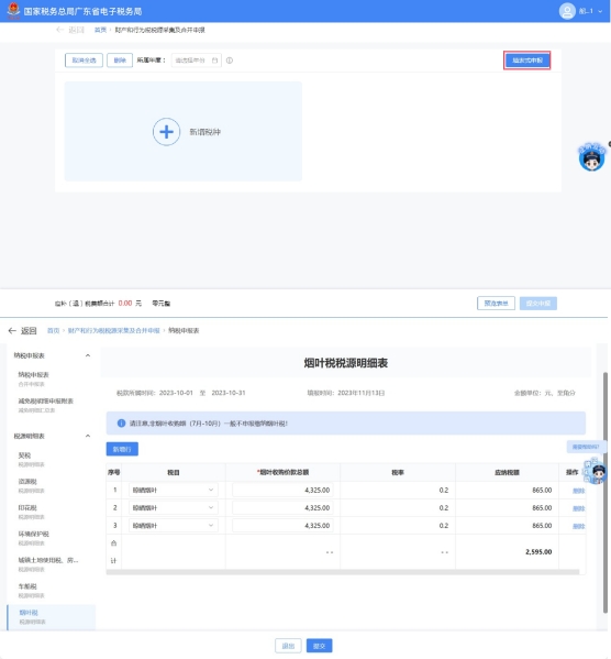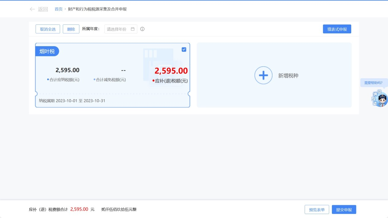 自动带出本期应申报的烟叶税卡片,可以自行勾选单个或多个税种进行申报,点击【提交申报】,申报成功。