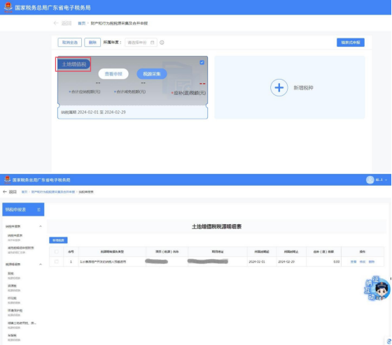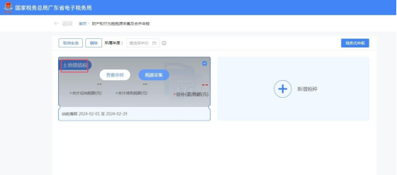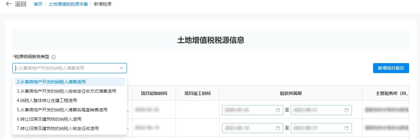 点击【新增税源】,进入新增土地增值税税源界面。税源明细报告类型可选择:1.从事房地产开发的纳税人预缴适用、2.从事房地产开发的纳税人清算适用、3.从事房地产开发的纳税人按核定征收方式清算适用、4.纳税人整体转让在建工程适用、5.从事房地产开发的纳税人清算后尾盘销售适用、6.转让旧房及建筑物的纳税人适用、7.转让旧房及建筑物的纳税人核定征收适用。