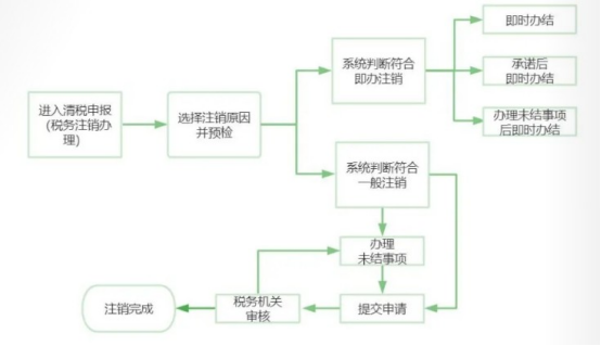 纳税人不符合简易注销条件的,需要通过电子税务局【清税申报(税务注销办理)】模块申请普通注销,普通注销分为即办注销和一般注销流程,流程如下: