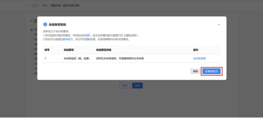c.如系统告知未结事项(如下图),纳税人可通过签署承诺书进行承诺制即办注销也可以先办完未结事项后再注销。