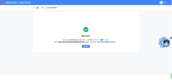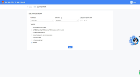 纳税人进行企业所得税清算报备时,选择“清算报备日” “清算结束日”“清算原因”,确认无误后,点击【提交】,纳税人变更为清算状态。