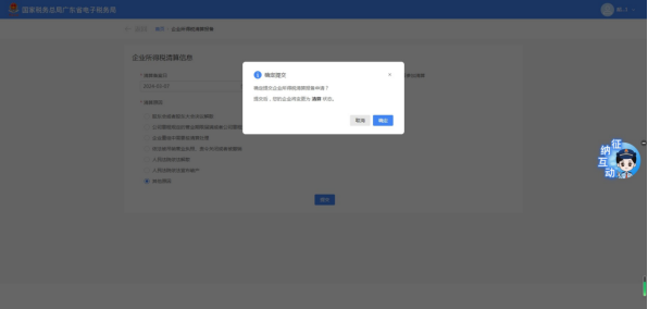 “主管税务机关是否参加清算”选项不可修改,由系统根据纳税人是否存在未结清税款自动判断选择,若存在未结清税款的,主管税务机关默认参加清算;不存在未结清税款的,主管税务机关不参与清算。