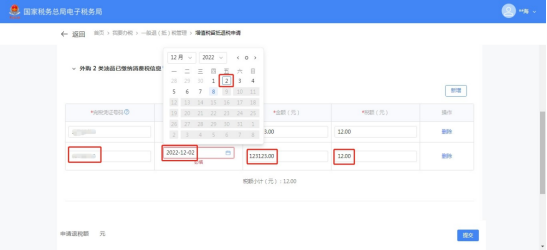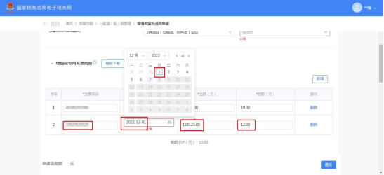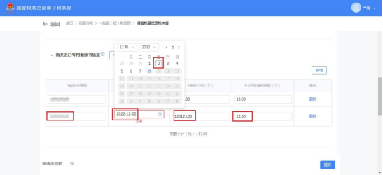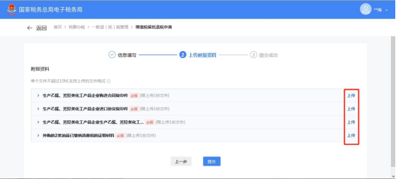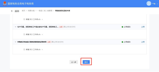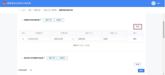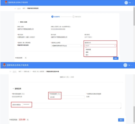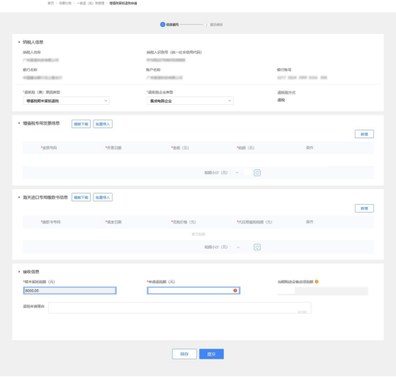 (1)选择退抵税方式,录入申请退税额和退税申请理由,点击【提交】。