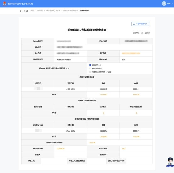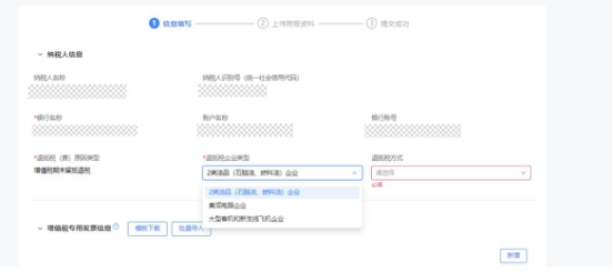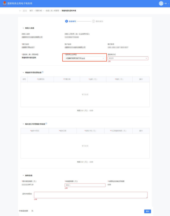 进入页面后自动预填纳税人名称、纳税人识别号、银行账户信息和退抵税企业类型等信息。