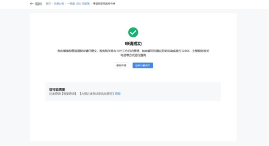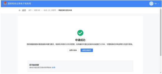 5.系统跳转申请成功界面。可点击【撤销申请】按钮撤销本次退税申请,点击【返回办税首页】按钮回到首页。