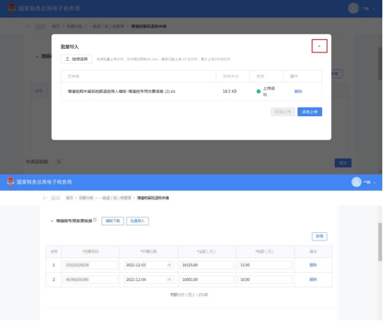 (11)上传成功后点击界面框右上角【×】关闭批量导入界面,增值税专用发票信息栏带出已导入的发票信息。