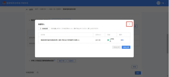 (20)点击界面框右上角【×】关闭批量导入界面,海关进口专用缴款书信息栏带出已导入的海关进口专用缴款书信息。
