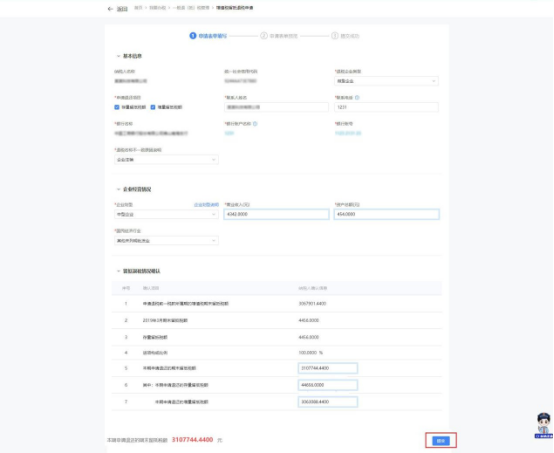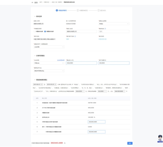 2.若退税企业类型属于“特定行业”(“制造业、科学研究和技术服务业”、“电力、热力、燃气及水生产和供应业”、“软件和信息技术服务业”、“生态保护和环境治理业”、“交通运输、仓储和邮政业”、“批发和零售业”、“农、林、牧、渔业”、“住宿和餐饮业”、“居民服务、修理和其他服务业”、 “教育”、“卫生和社会工作”、 “文化、体育和娱乐业”)的,系统自动带出留抵退税申请信息。纳税人根据实际情况修改留抵退税申请信息,点击【提交】,系统跳转申请表单预览界面。