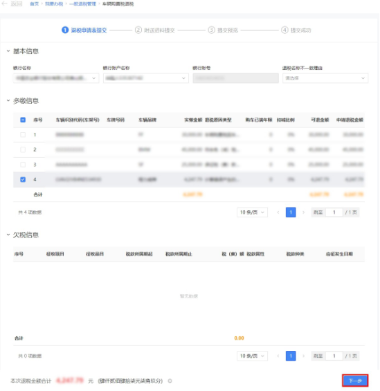 (一)进入车辆购置税退税界面,系统自动预填银行账号信息,并带出所有可退的车辆购置税信息,勾选需要退税的数据,系统自动计算本次退税金额合计。核对金额无误后,点击【下一步】按钮。