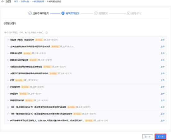 (二)系统跳转附送资料提交界面,如需上传附送资料,可点击【上传】,选择文件并上传后,点击【下一步】按钮。