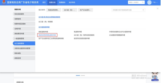 (1)登录新电子税局后,点击【我要办税】-【出口退税管理】-【出口退免税申报】-【购进自用货物免退税申报】功能菜单。
