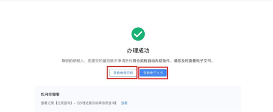 1.若纳税人及提交信息符合智能审核规则,则进入办理成功界面,留抵抵欠流程自动办结。