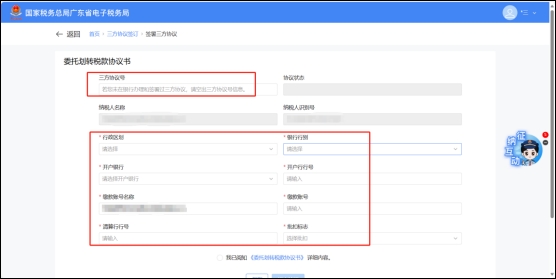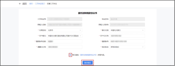 当纳税人所选择的银行行别已开通直签业务的,纳税人可以线上直接完成签订(如下图),无需再到银行网点签订纸质三方协议。将信息填写完成后,点击【委托划转税款协议书】,确认无误,点击【提交验证】,验证通过后则新增成功并可以正常使用。