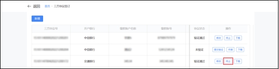 进入三方协议签订界面,只能终止验证通过的协议,点击【终止】,终止成功后该协议将无法继续使用,如还需使用三方协议进行税费款缴纳,应重新签订三方协议。