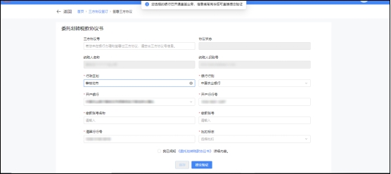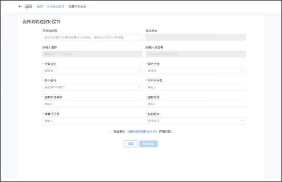 保存成功,点击【委托划转税款协议书】,对协议书进行下载和打印,并持纸质协议书到银行办理三方协议验证服务。线下办理完成后,需要再次进入【三方协议签订】,点击【提交验证】,验证通过后,三方协议才能进行使用。
