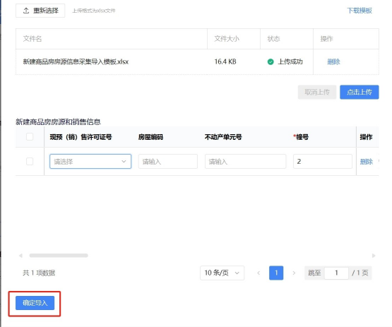 (3)上传成功后,可手动修改需要改动的房源或销售信息,点击【确定导入】。系统返回新建商品房房源信息采集界面,勾选需要采集的房源信息(可多选),点击【提交】,保存成功即可。