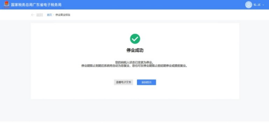 3.跳转至停业成功界面,界面给出提示信息:“您的纳税人状态已变更为停业。停业期限止到期后系统将自动为您复业,您也可在停业期限止前延期停业或提前复业。”