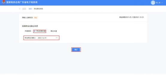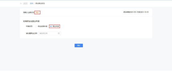 2.选择【停业延期申请】,并选择新设停业日期止,新设停业日期止不能早于上次停业日期止且不能大于首次停业日期起+1年。点击【确定】。