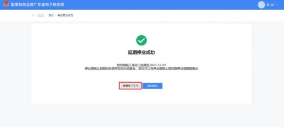 3.跳转至延期停业成功界面,界面给出提示信息:“您的纳税人停业已延期至***停业期限止到期后系统将自动为您复业,您也可以在停业期限止前延期停业或提前复业”。点击【查看电子文书】,可以下载停业登记通知书。