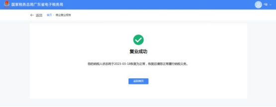 3.跳转至复业成功界面,界面给出提示信息:“您的纳税人状态将于***恢复为正常,恢复后请您正常履行纳税义务。”