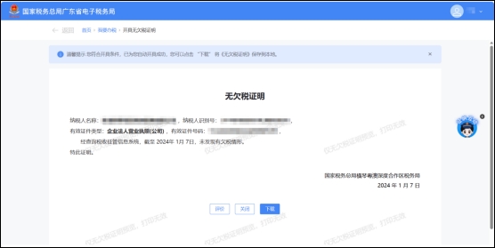 若申请人不存在未办结事宜,直接进入开具无欠税证明界面,点击【下载】可下载PDF格式表单。